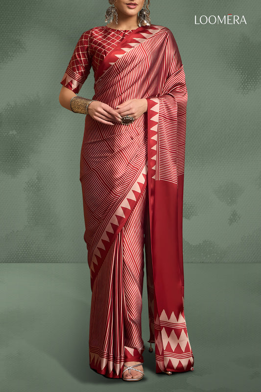 Coral Red Gaji Modal Silk Saree with Multicolour Stripes