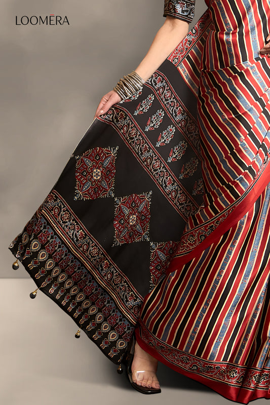 Brick Red Gaji Modal Silk Saree with Ajrakh Prints