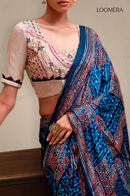 Ocean Blue Gaji Silk Saree with Khadi Embroidered Blouse Piece